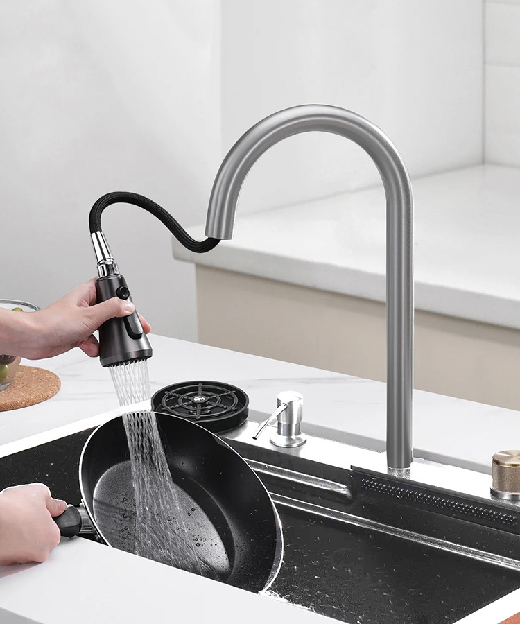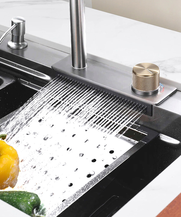 Şelale akışlı çıkışı ve entegre sepetiyle; meyve ve sebzelerinizi daha hijyeniz bir şekilde yıkarken, su tasarrufu sağlayın.